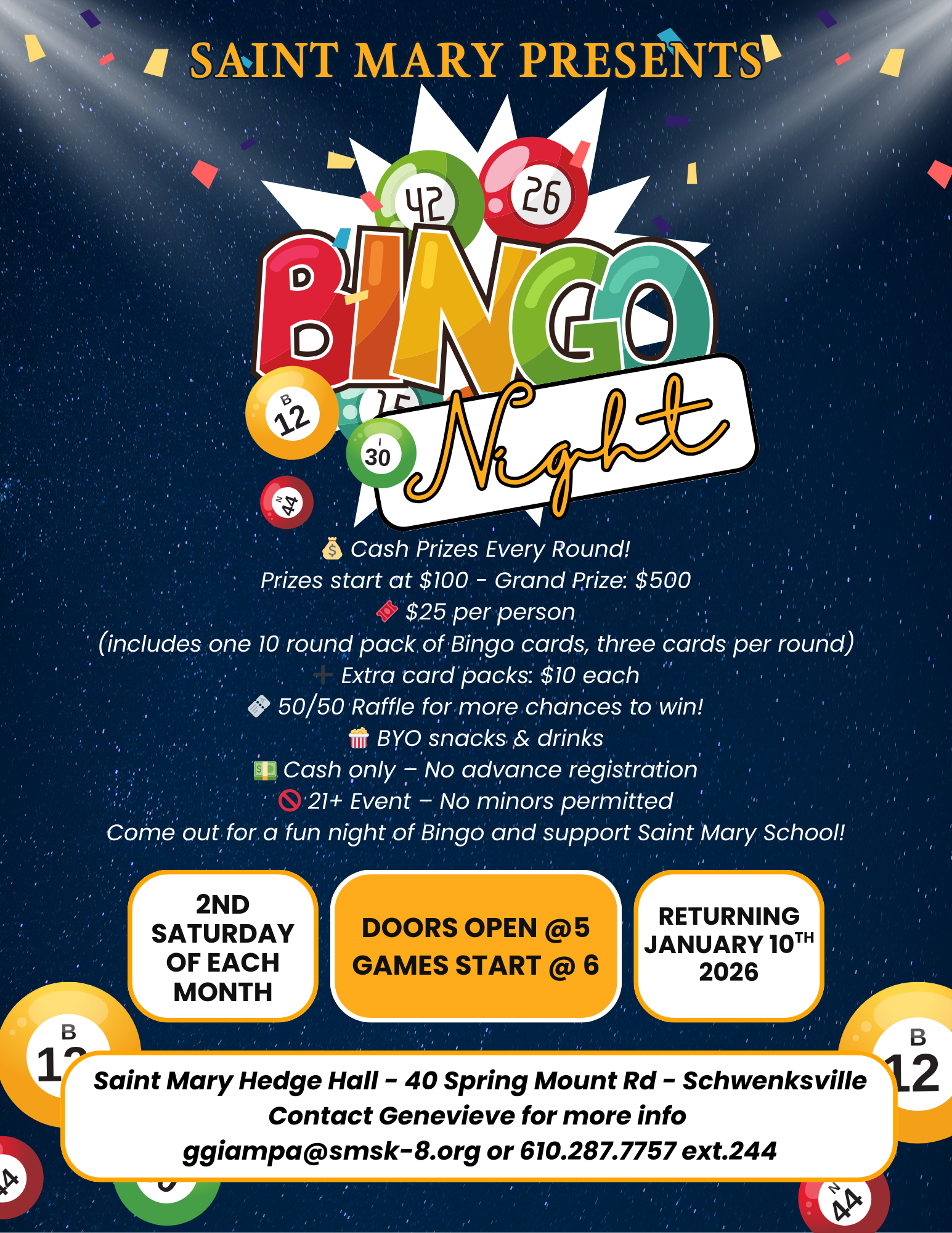 Mark your calendars: Saint Mary Bingo Night resumes on Saturday, March 14, 2026, and will be held every 2nd Saturday of the month in Hedge Hall.